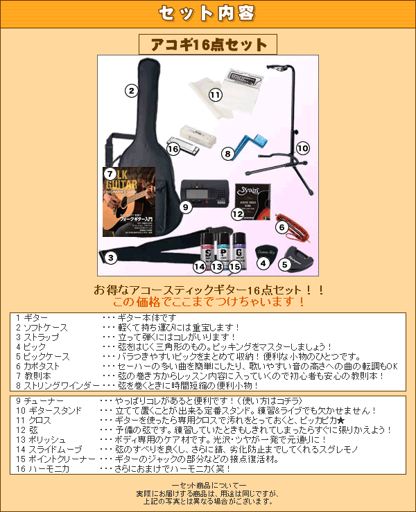 学生時代にやっていたギターをもう一度やろうと思い入門セットを購入しました。13.000円くらいで送料無料の16点セットです!